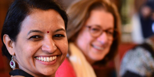 South Asian woman in sari and white woman in blue tee-shirt stand shoulder to shoulder and smile at the camera
